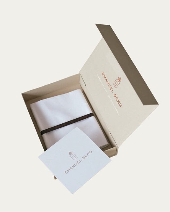 Luksusowa koszula szyta na miarę w postaci eleganckiego pudełka prezentowego zawiera najwyższej jakości biały materiał bawełniany Twill marki Thomas Mason®, pochodzący z renomowanej włoskiej tkalni Cotonificio Albini. W każdym pudełku znajduje się voucher uprawniający obdarowaną osobę do stworzenia koszuli w jednym z salonów Berg’s.